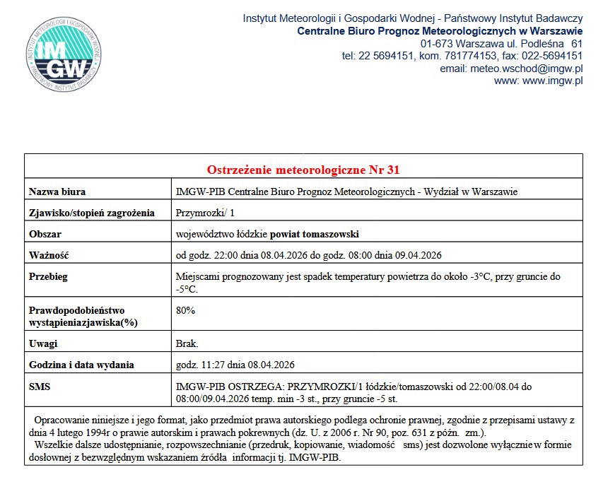 Z uwagi na wystąpienie na terenie Gminy Budziszewice szkód powstałych w wyniku niekorzystnych zjawisk atmosferycznych – przymrozki wiosenne – w dniach od 26 maja 2025 r. do 6 czerwca 2025 r. do godziny 15.00 w Urzędzie Gminy w Budziszewicach, pok. Nr 2 (parter) przyjmowane będą wnioski o oszacowanie szkód w gospodarstwach rolnych i sadowniczych.